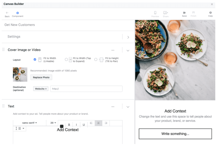 הקאנבס של פייסבוק מאפשר לכם להוסיף המון מרכיבים שונים, כולל: כותרות, כפתורים, טקסט, סרטונים ותמונות.