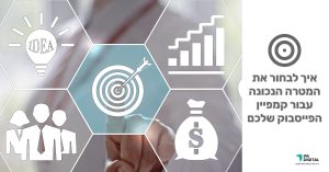 זמן קריאה: 6 דקותמה המטרה שלך? הדבר הראשון שיש לעשות כשניגשים לפתוח קמפיין מודעות בפייסבוק הוא לבחור את מטרת הקמפיין, למעשה, בחירת מטרת הקמפיין קובעת מבחינת פייסבוק את